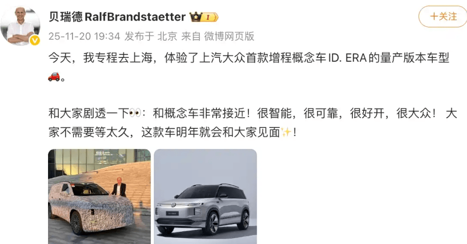 近日,大众汽车集团(中国)董事长兼首席执行官贝瑞德通过社交平台,首次曝光了上汽大众ID.ERA量产版的官方伪装实车谍照,正式确认新车将于2026年首发,有望在北京车展完成公开亮相,引发市场高度关注。