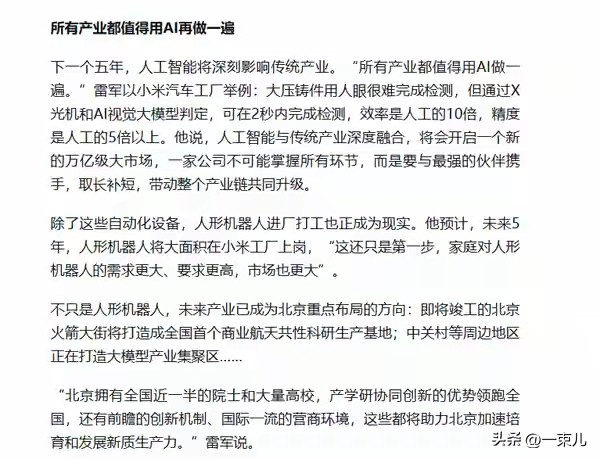 从制造业的效率革命到消费端的体验升级,从工业机器人到家庭智能设备,AI正在重构每一个产业的核心逻辑。雷军与小米的实践证明,AI不是锦上添花的工具,而是重塑产业竞争力的核心引擎。下一个五年,随着芯片算力的提升、大模型的普及、场景数据的积累,AI将从互联网、消费电子等领域,全面渗透到新能源、新材料、医疗健康等传统产业,让“智能化”成为所有行业的标配。