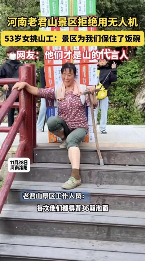 “不是机器不好,是它会抢了我们的活路。”53岁的雷玉琴背着100斤物资,在老君山60度陡坡的石阶上每走36步就歇一次脚,磨得发亮的扁担压弯了她的脊背,却撑起了全家的生计。11月28日,老君山景区明确拒绝用无人机替代挑山工的决定,瞬间引发全网热议:有人赞其“人情味拉满”,有人斥其“守旧反智”,而挑山工们的真实心声,却道破了这场科技与人性之争的核心——效率之外,更该有人的温度。